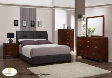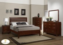 The Beaux Collection. The distinct nail-head framed dark brown bi-cast vinyl padded headboard and footboard are the focal points of this collection. A second bed option is avaialable in beige linen fabric. Dark Cherry finish