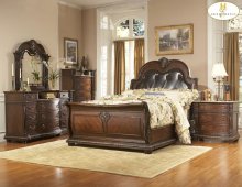 The Rivera Collection. Both all-wood bed and upholstered bed with dark brown Leatherette insert are available. Constructed of select hardwoods and veneers in a warm brown brown cherry.