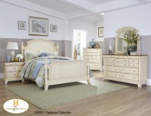 The Palace II Collection. With egg and dart base moldings, rope twists under case tops and on bed posts, acanthus and tobacco leaf carvings, florets and inset marble tops, this collection has it all. These many exquisite details married with a rich bisque finish combine to create an ideal European environment.