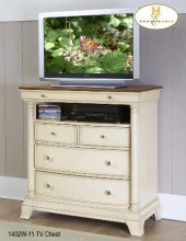 The Inglewood II Collection. Wood and metal drawer pulls accent the traditional case pieces. This collection is presented in a unique antique white finish with cherry finish case pieces tops.