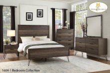The Liatris Collection. Book match acacia veneer is highlighted with a grey undertone that serves to reflect the natural highs and lows of the wood's grain. The sturdily angled legs are providing a solid support structure to each piece. The ultra-low profile of the bed maintains the sleek look of the collection as does the clean framing of the case goods.