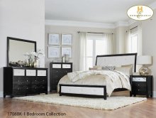 The Odelia Collection. The striking silver finish of this collection serves to highlight the decorative accents that reign the design - crocodile embossed drawer fronts with polished nickel hardware, mirrored top drawer fronts with their faceted knob hardware and crystal-embellished button tufted pear bi-cast vinyl inserts on the headboard and footboard. Also available in Black finish.
