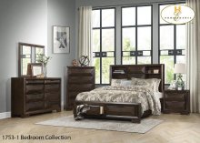 The Chesky Collection. Birch veneer is finished in a warm espresso in this unique bedroom offering. Raised panels provide visual interest to the drawer fronts, headboard and footboard. the bookcase headboard provides ample storage and display space as does the storage drawer footboard.