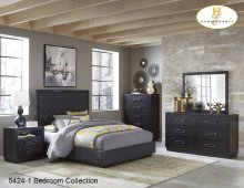 The Caruth Collection. The grey finish over v-matched oak veneer serves as the backdrop for the headboard's grey, button-tufted, fabric insert and contrasting drawers hardware. Sawtooth molding provides distinct accent to the top drawer fronts, mirror and bed framing. Providing additional functionality to the collection is the mounted electrical charging station with USB ports.