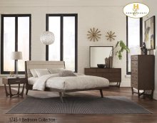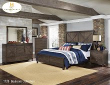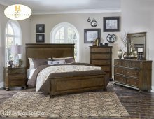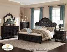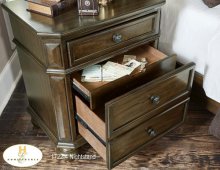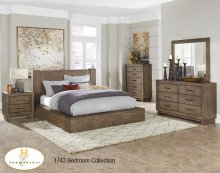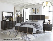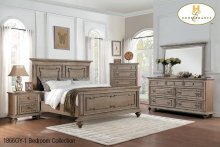 The Marceline Collection. The striking grey finish of the collection features hand rub-through distressing for a subtle look. Geometric molding provides a distinct contrast to the traditionally framed case goods. Substantially sized turned legs enhance the look of the oversized case pieces and mansion headboard.