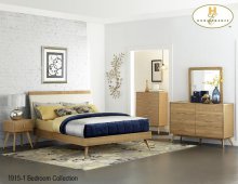 The Anika Collection. The curved framing of each case piece is perfectly accentuated by polished chrome hardware and features soft-close mechanisms on the doors and storage drawers for quiet and sure closure. Offered alongside the traditional case pieces is a four-door chest. Ivory bi-cast vinyl covers the padded wood rail-topped headboard, providing stark contrast to the light ash finish over ash veneers. All pieces in the collection feature tapered legs that are signature to this classic look.