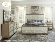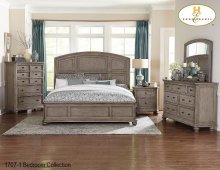 The Lavonia Collection. The eye-catching dramatic curve of the headboard creates instant appeal when taking in the design of this collection. The framing of the headboard carries over the design of the low profile footboard and turned-foot supported recessed drawer front case pieces. Modern technology comes into play with the power strip-with USB port-charging station that is mounted to the upper back of the nightstand. A grey wire-brushed finish over oak veneers furthers the classic look of this bedroom collection.