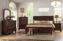 The Begonia Collection. Casual transitional styling lends versatility to the placement of the Begonia Collection in a number of bedroom settings. The Cherry finish lends distinctly to the execution of different looks from traditional to country casual, with knob hardware punctuating the look of each framed drawer front. Hidden drawers in the nightstand and dresser provide discrete storage for your valuables, while the storage drawers of the footboard provide a more visible means of additional storage capability. Bun feet support the case goods and a sleigh headboard finish off the transitional design of the collection.