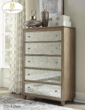 The Odelia Collection. The striking silver finish of this collection serves to highlight the decorative accents that reign the design - crocodile embossed drawer fronts with polished nickel hardware, mirrored top drawer fronts with their faceted knob hardware and crystal-embellished button tufted pear bi-cast vinyl inserts on the headboard and footboard.