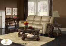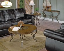 The Jenkins Collection. This group shows a strong personality with the look of a leather edge banding and etched center motif, curved metal base and a rich warm tobacco finish.