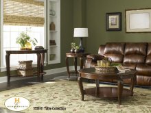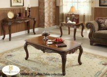 The Higgens Collection. The tables are edged with graceful scalloping, the table legs feature a spoon foot design and the aprons are accented with box-frame molding and floral medallions.