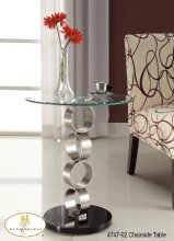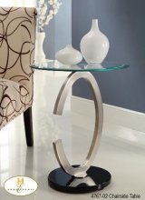 The Galaxy Collection. Glass is perched atop each of the uniquely designed brushed chrome supports in this collection. Each piece serves to accent contemporary home decors from ultra minimalist to the very whimsical.