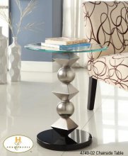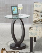 These chairside tables use artistic form to produce simple function. Beveled glass is perched atop curved wood supports with matching wood bases. These unique designs with Zen-like simplicity tucks netly bsde a chair or sofa, serving to accent your home decor.
