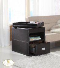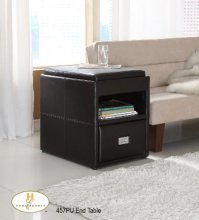The Carbon Collection. This is a stand-alone end table that functions not only in the living room but alongside a number of our upholstered beds to complete the contemporary look of your bedroom. The dark brown bi-cast vinyl is accented with contrast baseball stitching and features drawer storage.