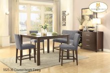 The Fielding Collection. Unfettered design makes for a classically refined profile, while black inset glass is utilized for perfect contrast to the brown finish of the wood. Chairs are covered in dark grey fabric. Offered in both traditional and counter-height.