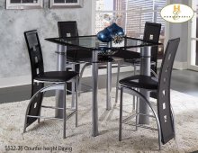The Sona Collection. Immediately drawing your attention and providing stylistic drama to the casual dining group is the silver finished metal base, dual glass top and elongated cut-away bi-cast vinyl backs of the chairs.
