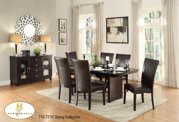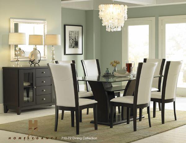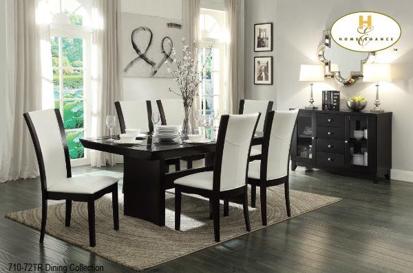 | The Daisy Collection. Features a great modern look with clean lines, sleek curves, and superb combination of refreshing espresso wood finish, satin nickel hardware, and leather-like bi-cast Leatherette. Three table options are available: 72" glass top table, 71" cherry veneered table, and 54" round glass top table. Two chair options: White Bi-cast Leatherette and dark brown Bi-cast Leatherette. |
