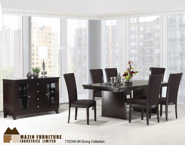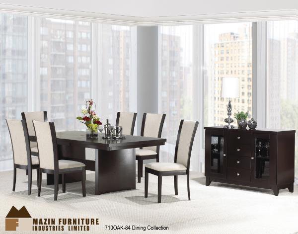 | Rich oak veneers finished in a dark espresso lacquer creates this subtle yet elegant dining room. It features a unique ball-bearing slide mechanism which allows to open and close the table top from end, by just one person, with ease. Gracefully curved trestle bases are mirrored by high-back chairs with their own graceful flare, available in your choice of chocolate or beige linen fabric. The matching sideboard has excellent storage capacity, with felt-lined drawers and glass display side panels. |