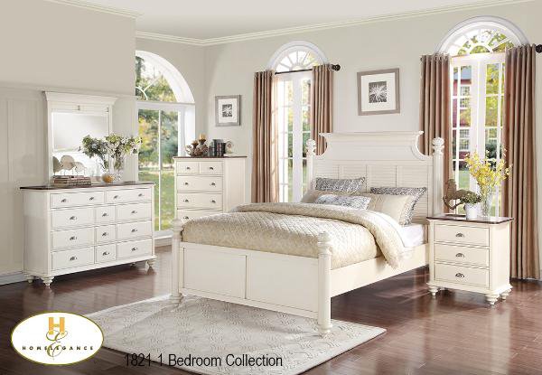| The Floresville Collection. The antique white finish is accented by the dark cherry tops of the case goods, creating a two-tone look that proves to be eye-catching. Turned finials perch atop the round pilaster supports of the platform bed while simultaneously drawing attention to the distinct shape and louvered accent of the headboard. |