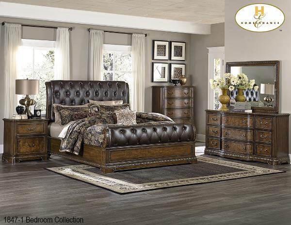 | Traditional Bedroom Collection featuring a Dark Brown Leatherette headboard and footboard accented in a Cherry finish. Night stand and dresser have a hidden drawer. |