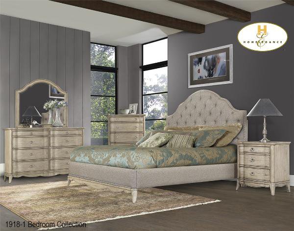 | Traditional Bedroom Collection featured in a Distressed Antique White finish and a fully upholstered bed. |