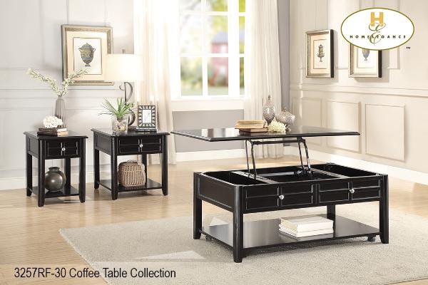 The Carrier Collection. Designed for placement in a number of living room settings, the Carrier Collection is a functional and stylish addition to your home. The cocktail’s tabletop lifts to extend to your seated position and is supported by casters for ease of movement, the end table and chairside table feature a functional drawer. All three pieces in the collection feature lower display shelving. A dark espresso finish further lends to the look of this versatile occasional grouping. |