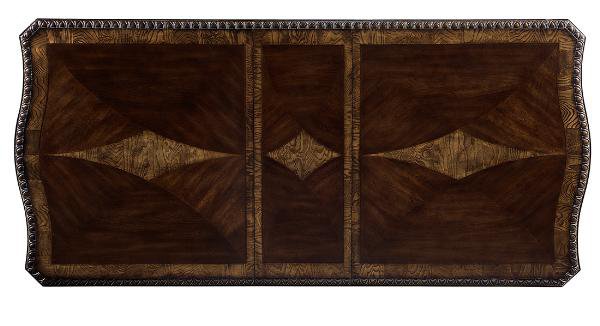 | The Bonaventure Park Collection. With styling that exemplifies traditional design, the Bonaventure Park Collection exudes sophistication and refined elegance. Cantered pilasters frame the serpentine fronted china and server, while egg and dart molding, acanthus leaf motif and bale, and button hardware lend to the traditional look of all pieces. Burl inlay creates beautiful contrast to the gold-highlighted cherry finish of the collection. Two table options provide flexibility for placement in your dining space – the first, a 110-inch double pedestal base rectangular top table, the second, a 76-inch oval top single pedestal base table. Button-tufted traditional tweed fabric features prominently on the accompanying wood-framed chairs. |
