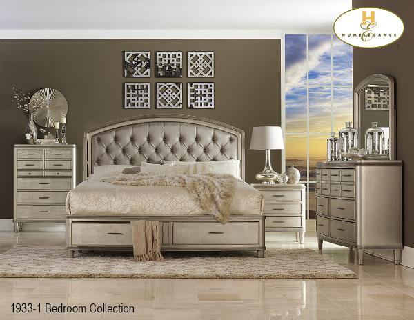 | Contemporary Bedroom Collection offered in a Silver finish accented by the tufted upholstered headboard and storage footboard. |