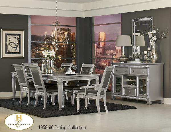 | The Bevelle Collection. Modern glamour is exemplified in the design of the Bevelle Collection. Acrylic crystals frame each piece in the collection, reflecting the light to create eye-catching drama. The silver finish serves as the perfect complement to the high-polish decorative knob hardware of the china and server while medallion accents grace all pieces. Providing contrast to finish is the dark gray bi-cast vinyl of the side chairs and arm chairs. A coordinating bedroom is also available. |