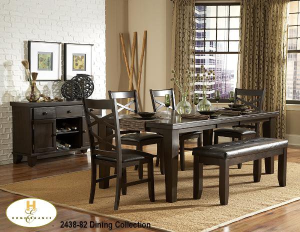| The Hawn Collection. Drawing from the basic form of the Arts & Crafts movement and subtly adding modern lines, casual dining will never look the same in your home with the addition of the Hawn Collection. A rich walnut finish highlights the walnut veneer on this substantially sized table. Double X-back chairs feature a dark brown bi-cast vinyl seat that compliments the table and accompanying buffet server. Additional seating in the form of a tufted bench is also available. |