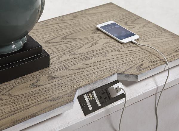 | Contemporary Bedroom Collection featuring a power strip on the back of the night stand. |