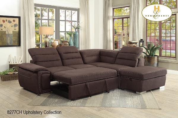 | 3pc Sectional featuring a pull-out bed, adjustable headrests and a storage ottoman. Offered in Chocolate Fabric |