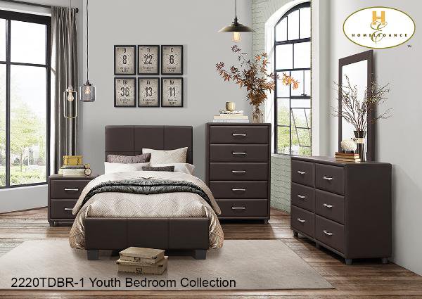 | The Lorenzi Collection. The contemporary design of the Lorenzi Collection is enhanced by the addition of the durable dark brown vinyl covering that encases each piece in the collection. Painted gray hardware provides a distinct contrast to the fabric’s finish. Scaled for urban living, this collection will prove to be a unique and stylish addition to your master, youth, and guest bedrooms. |