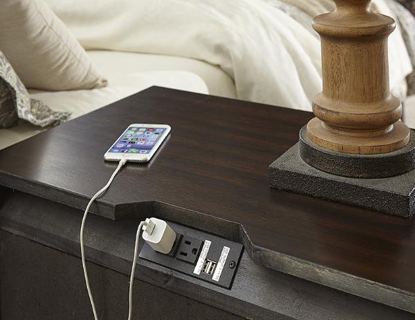 | Contemporary Bedroom Collection featuring a Power Strip on nightstand and all in Espresso finish. |