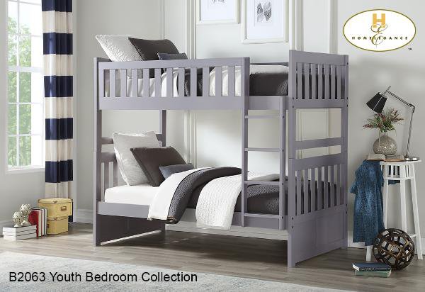 | Youth Bedroom Collection offering Twin/Twin, Twin/Full, Full/Full, Twin Captain's Bed and a Twin/Twin Step Bunk beds finished in Grey. |