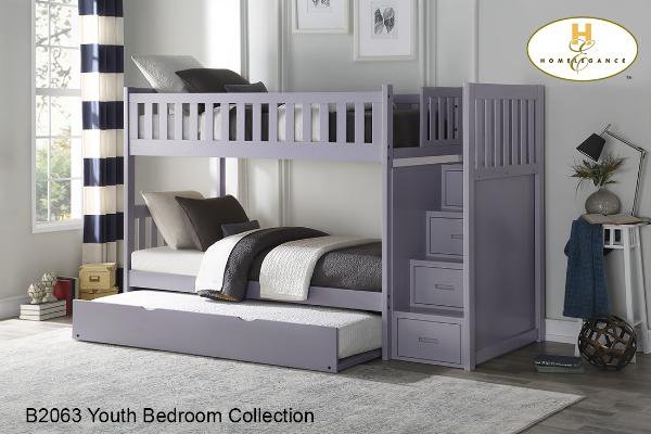 | Youth Bedroom Collection offering Twin/Twin, Twin/Full, Full/Full, Twin Captain's Bed and a Twin/Twin Step Bunk beds finished in Grey. |