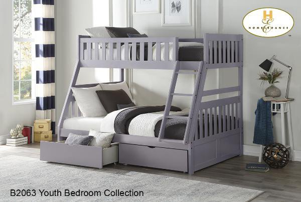 | Youth Bedroom Collection offering Twin/Twin, Twin/Full, Full/Full, Twin Captain's Bed and a Twin/Twin Step Bunk beds finished in Grey. |
