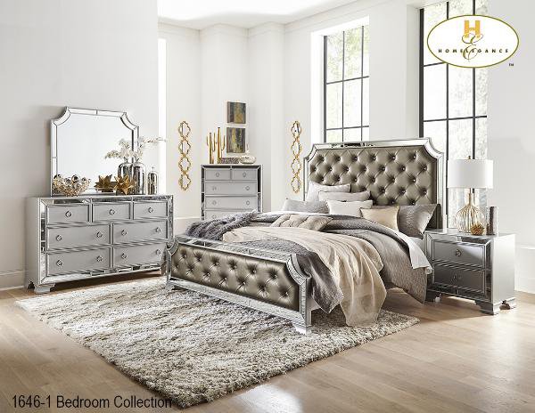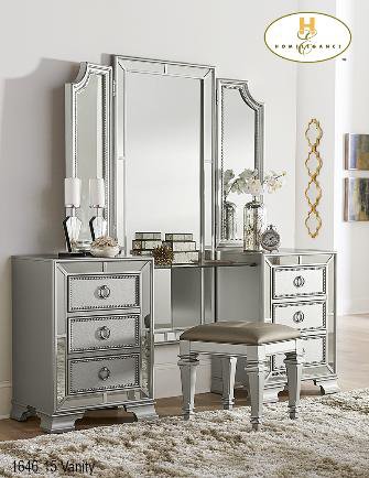 | The Avondale Collection. Mirrored framing immediately draws your eye to the modern-traditional profile of the case goods and bed as do the clipped corners on the mirror, bed and vanity. The silver finish of the collection is illuminated not only by the reflected light off the mirrors, but it is also enhanced by the contrasting silver grey crystal button-tufted accents on the headboard and footboard. |
