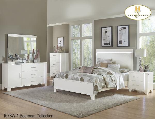 | The Kerren Collection. LED enhances the front side of each case piece and top rail of the bed. Providing additional eye-catching drama is the white opalescent bi-cast vinyl headboard, shimmering in the glow of the LED light. The door dresser provides ample space for storage alongside the night stand and chest. |