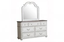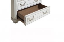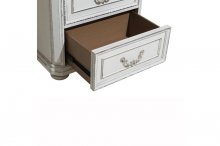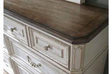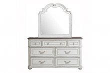 Inspired by the look of French Provincial styling, the Willowick Collection lends an air of classical romanticism to your opulent bedroom. Bold curves, elegant framing and the lightly distressed finish create eye-catching drama while antiqued hardware and turned feet are the decorative accouterment that ties the look together. Subtle rub-though of the antique white finish reveals gray undertones, that when paired with brown cherry finished tops, serves to highlight the poplar solids, along with the ash veneer. The dramatic sleigh bed, with button-tufted neutral tone linen headboard insert.