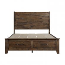 Classic transitional design serves as a base for the natural qualities of the solid wood utilized to create the rustic look of the Jerrick Collection. Metal hardware furthers the authentic rustic look of the Eastern King platform storage bed while a burnished finish serves to highlight the solid wood grain while allowing each plank to serve as a unique accent to the overall design. The functional drawers of the footboard allow for extra storage space within your bedroom.