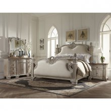 An updated look to the grandeur of Old World Europe is flawlessly executed in the Orleans II Collection. Acanthus leaf carvings feature prominently and blend with elegantly appointed moldings on the California King bed. Wreath accents lend dramatic flair to the bed as does the sculpted lion’s foot base. Heavy pilasters rise and topped with carved finials on the neutral-toned, linen-accented headboard and footboard. The washed white and weathered brown two-tone finish lends to the unique styling of this elegant bedroom collection.