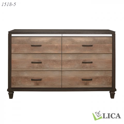 Rustic style is paired with modern accent to create the bold look of the Danridge Collection. Embossed faux wood veneer presents a realistic wood-look with brown and espresso blending to create the two-tone finish. Antiqued brass finish hardware fronts the drawers of the dresser and a mirrored strip provides decorative accent.