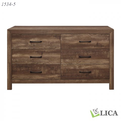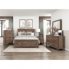 Modern lines and rustic styling are paired to create the look of the Corbin Collection. The 3D printed paper veneer’s texture is highlighted by a brown finish for a realistic wood look. Providing complementing contrast, the drawer fronts of the dresser feature black metal hardware. Subtle framing defines the profile of the dresser, further lending to the unfettered design of the collection.