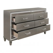 Designed to help your bedroom reach its full glamorous potential, the Tamsin Collection’s unique attributes blend to create a stylish and functional addition to your lifestyle. Mirrored framing provides dramatic enhancement to the dresser, illuminating the silver-gray finish. Acrylic hardware provides unobtrusive decorative touch to the drawer fronts of the dresser. Hidden jewelry drawers in the dresser create discrete storage space for your fancy accoutrements.