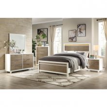 A study in contrast, the Renly Collection blends modern lines and the distinct natural appearance of wood grain to create a unique addition to your bedroom. White framing boldly contrasts the natural finish of oak veneer of the drawer fronts of the dresser. Horizontal mount brushed nickel hardware further lends visual interest to the face of the unit. Coordinating bed – in queen, full and twin – nightstand, mirror and chest are also available.
