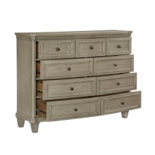 Designed for the modern traditional home, the Vermillion Collection is a light and airy take on the themes of classic style and refined elegance. The subtly bow-fronted dresser features knob hardware and traditional framing that is enhanced by the distinct grain of oak veneer with subtle gray cashmere finish and walnut inlay.