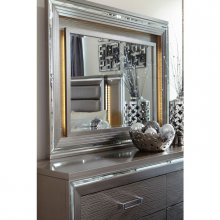 Designed to help your bedroom reach its full glamorous potential, the Tamsin Collection’s unique attributes blend to create a stylish and functional addition to your lifestyle. Mirrored trim provides dramatic enhancement to the mirror frame, while LED back-lighting, from the behind the mirror, illuminates and highlights the silver-gray finish of the collection.