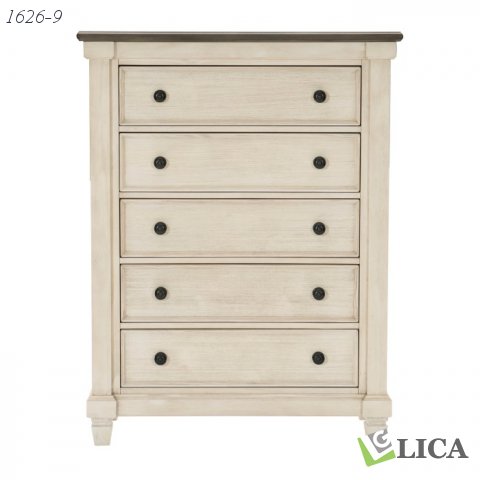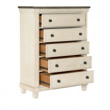 Transitional-rustic styling is expertly achieved in the design of the Weaver Collection. Antique white provides bold contrast to the rosy brown plank-style tops, with pine solids and oak veneer further lending visual texture to the chest. Classic framing paired with dark metal knob hardware complete the rustic look.