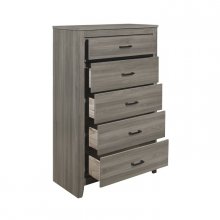 With a transitional look that lends to industrial, rustic and modern styling, the Waldorf Collection is a versatile choice for your bedroom. The printed wood grain of the performance laminate is featured in a gray tone allowing for neutral accent to your stylistic environmental choices. The dark finish of the horizontally mounted hardware creates distinct contrast to the neutral tone of the chest’s finish.